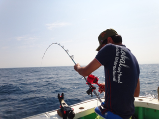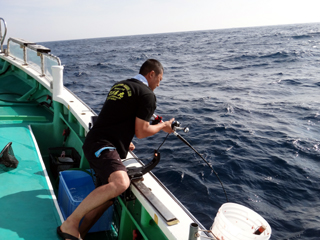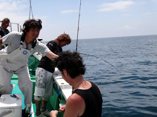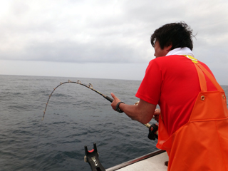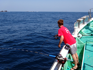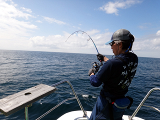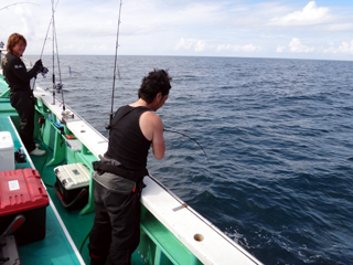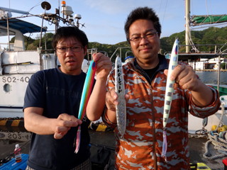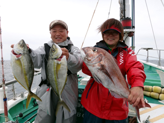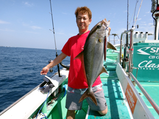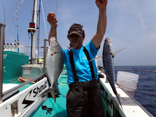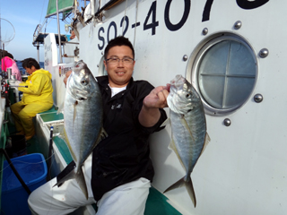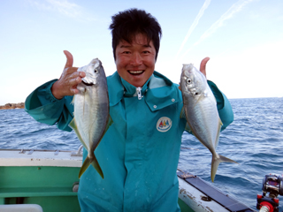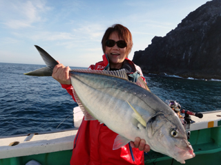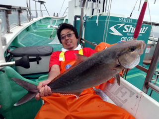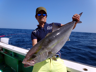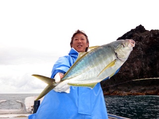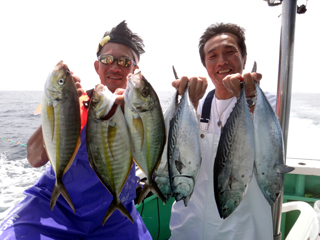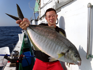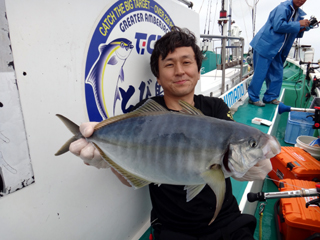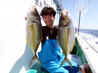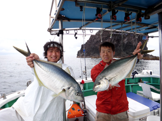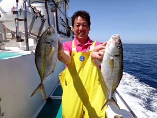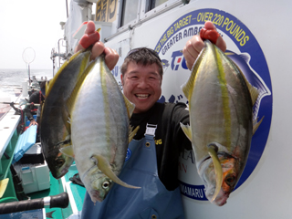 左 Dr,Hさん、流石の攻めでした!シマアジ2枚連続GET! 右 Sさん、鰺の泳がせでカンパチ4.75kg 一瞬のアタリを見逃しません!お見事です!