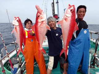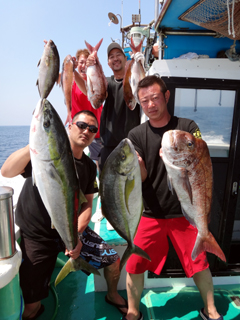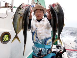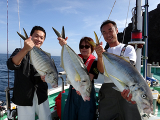 左 Nさん、親父さんとの思い出を胸に、オナガGETおめでとう! 中 Sさん、Nちゃん、スーパーSさん、オナガ4.15-5.3kg 超最高の海からの贈り物に感謝ですね!おめでとう! 右 Dr,Hさん、何でも釣ります!流石です。 オナガ4.2kgGET!