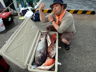 Gさん、クーラー満タン!ガッツポーズ!! 5/25 銭洲 18.5℃薄濁り シマアジ0.8-1.5kg級12枚、オナガ4本、真鯛1.5-2.4kg10枚、メダイ3.2-5.2kg5本、メジナ22枚、ウメイロ五目5-36枚