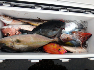 04/15 銭洲 16.0℃濁り シマアジ0.5-1.95kg1-5計18枚、カンパチ1.35-2.1kg0-3計4本、ウメイロ五目30-40cm級17-35枚 五目釣りパラダイス。気合い入れなおして行きましょう!!!