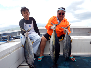 10/18 石花海23.4℃濁り ヤリイカ泳がせ仕立 キハダ31.05-33.45kg3本、メダイ9.1kg1本 Hさん、流石です!マグロ名人ですね(^-^)