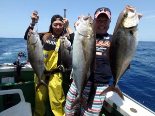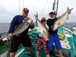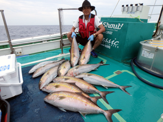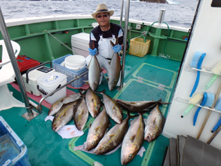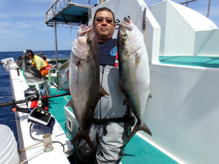 カンパチ1.3-9.65kg1-11計52本、シマアジ0.7-1kg級14枚、ウメイロ五目35cm級1-10枚、 気合いの探索に、カンパチ来ました!ルアカンばりばり!