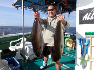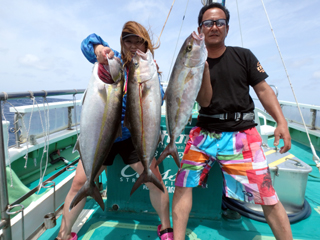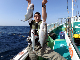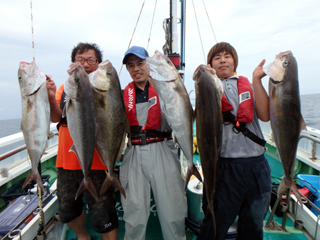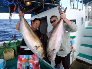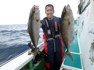 カンパチ6.1-7.65kg0-2計4本、シマアジ1.35-1.8kg0-4計9枚、ウメイロ五目35-40cm級2-20枚 ムロアジ泳がせでカンパチ4本GET!ムロアジ作戦!やったりました^ ^